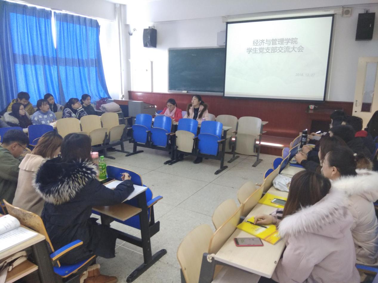 12月27日下午,经济与管理学院在博学楼东504开展学生党支部工作交流大会。本次大会由第一党支部书记袁爱荣主持,第二党支部书记陈丽芳与全体学生党员参会。