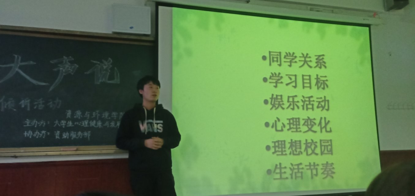 心理健康是大学生健康发展的基本要求,心理倾诉则是一种释放压力、增进交流的方式。4月11日,资源与环境学院在博学楼400举办了“用真挚的话语,触动你的内心‘我要大声说’”心理倾诉活动。