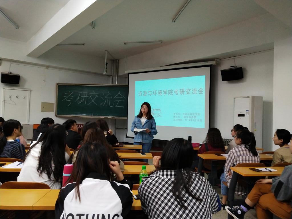为进一步帮助考研学生明确考研目标,科学分析考研信息,4月18日,资源与环境学院在博东104举办了考研汇报交流会。2015级11位同学与学弟学妹进行了交流。