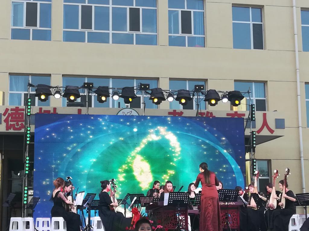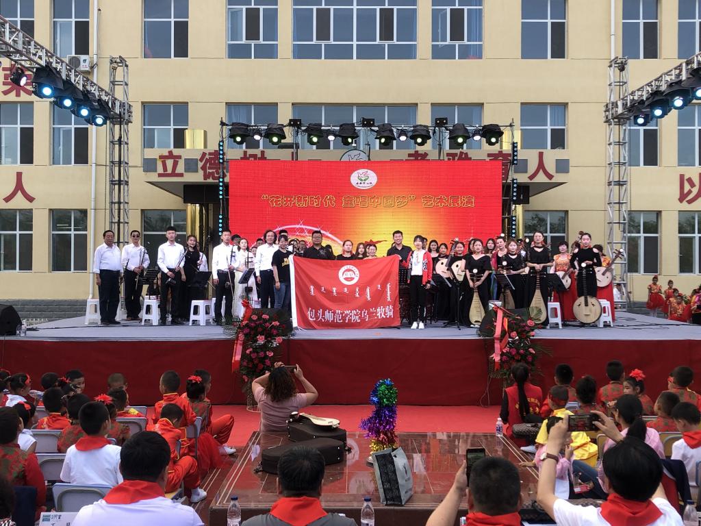 “国乐进校园”,让更多中小学生感受到中华优秀传统文化的博大精深,是包头师范学院乌兰牧骑民乐小分队心中的职责和义务。因此,全体党员师生赶赴五原县复兴中心校,与复兴中心校携手举办“花开新时代·同唱中国梦”演出活动。乌兰牧骑民乐小分队在苗燕老师、马佳老师和韩占坤老师的指导下,演奏了《花好月圆》、《瑶族舞曲》、弹拨合奏《三六》等曲目,让现场观众感受到了民族音乐的魅力。白雁老师演唱的《祖国,我的最爱》和张文华老师演唱的《草原上升起不落的太阳》将演出推向高潮,受到现场师生的热烈欢迎。