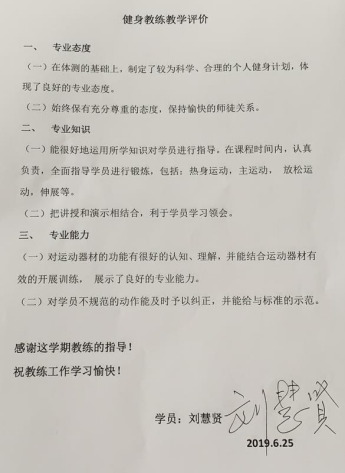 6月底,2016级健身教练专修班圆满完成了此次实践活动任务,学生在专业能力、沟通交流能力,分析问题、解决问题的能力方面都有所提高,专业知识和技能在实践中应用的意识大大提升,知道自己学习是要干什么,有了社会服务意识,专业认同感大大增强。更可贵的是学生在指导我校老师们健身的同时,也从老师们身上学到了很多做人的道理,这将使学生受益终身。老师们在实践活动结束,给学生们提出了中肯的评价和今后的改进建议。(体育学院)