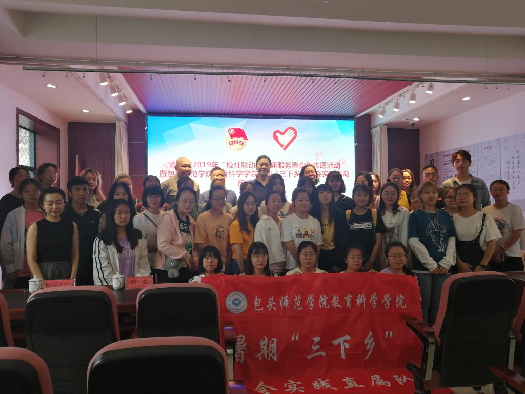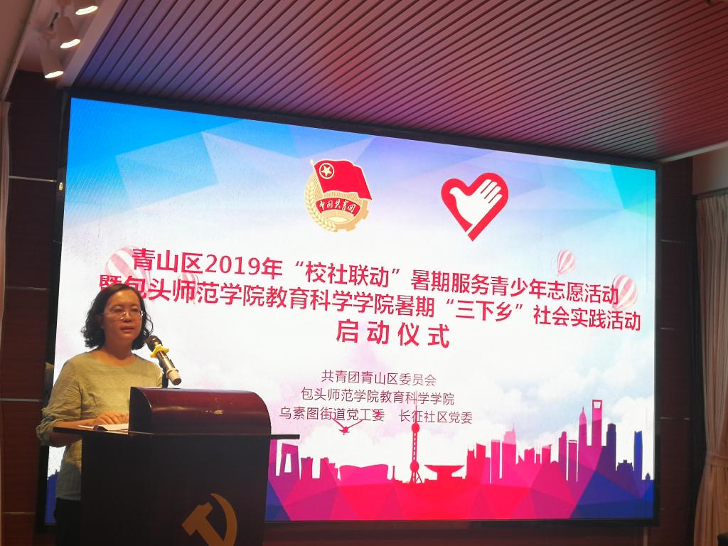青春心向党,建功新时代。8月19日,包头师范学院教育科学学院联合包头市青山团区委于乌苏图街道长征社区举行青山区2019年“校社联动”暑期服务青少年志愿服务活动暨包头师范学院教育科学学院暑期“三下乡”社会实践活动启动仪式。青山区团委副书记李峥,乌素图街道党工委副书记黄涛,长征社区党委书记田霞,包头师范学院教育科学学院党总支副书记、副院长袁秀利,教育科学学院团总支书记方丽慧,辅导员王璐然、张思秦、樊荣以及参与此次志愿活动的各社区负责人和39名教育科学学院青年志愿者代表参加了启动仪式。启动仪式由青山区团委赵荣琛同志主持。