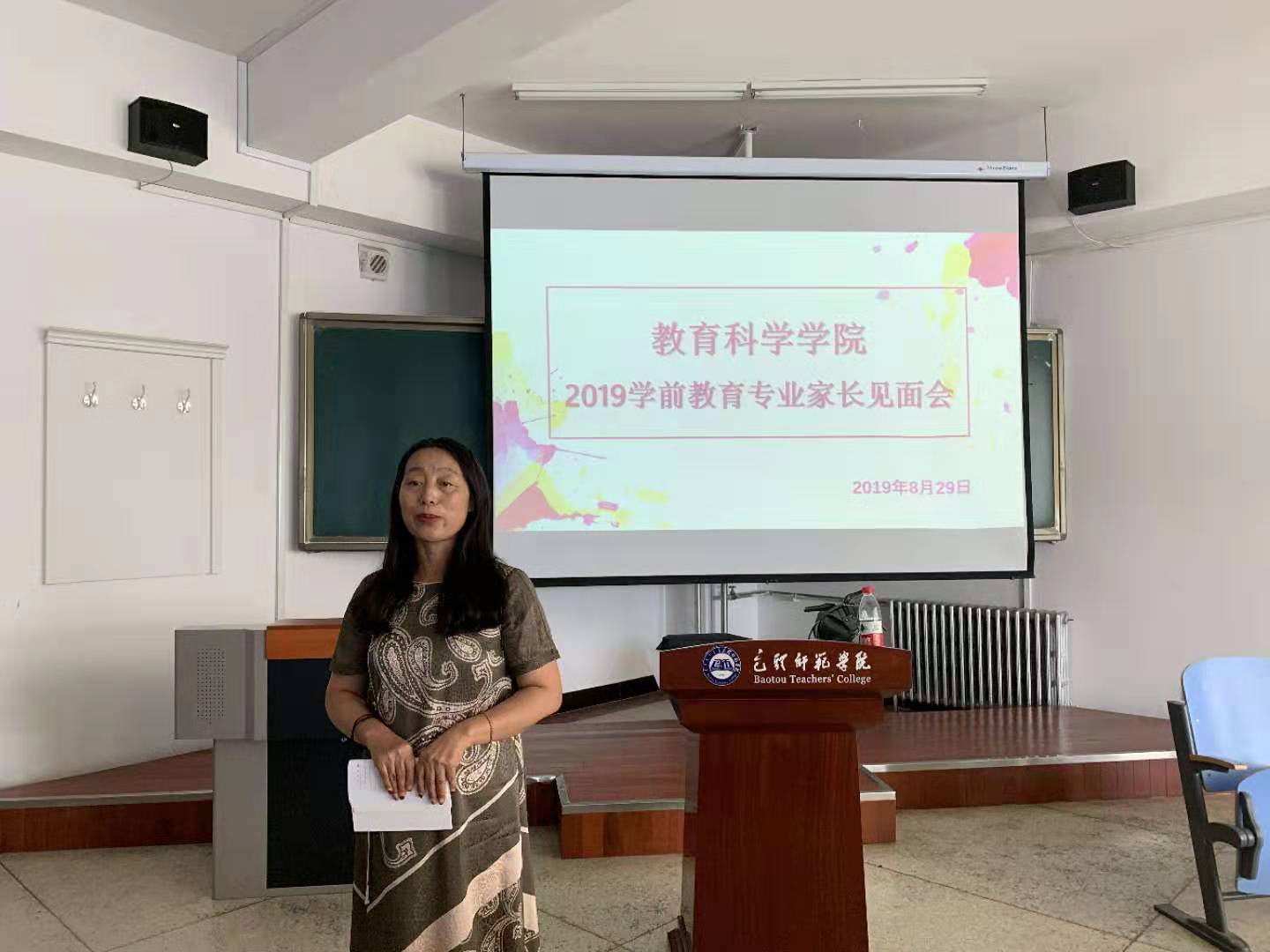 会议由党总支书记张岫峰同志主持。首先,张书记说明了召开此次会议的目的,并向家长们介绍了出席会议的学院领导、系主任、各班班主任及助理班主任以及学工办的老师,并代表教育科学学院向前来参加家长见面会的学生家长表示热烈的欢迎,对新生选择包头师范学院教育科学学院各专业学习表示诚挚的欢迎。随后,郝红英院长从学院的发展概况、专业设置、师资力量以及本科生人才培养方面的要求与举措等方面向家长们进行了详细介绍,向家长们分析了大学有关学习、生活的相关问题,并强调了在学生管理与发展上家长作用发挥的重要性。学院副书记副院长袁秀利,以学生教育管理工作角度出发,从深入学习贯彻党的十九大精神、扎实推进思想教育工作,加强学风建设、全面提升学生管理水平,增强服务学生意识、拓宽服务渠道、深化服务发展型工作理念,关注特殊学生群体,以积极分子和预备党员培养、教育为基础做好学生党建工作,加强安全稳定工作、构建平安校园等方面为家长进行详细讲解。分管教学工作的李芳副院长从完全学分制、过程性评价、教师职业技能考核、选修双学位等方面进行了详细的介绍,她结合学籍管理办法,指出大学自主学习的特点、要求以及大学与高中学习方法的差异,希望家长转变观念,积极与学院、孩子沟通,加强对孩子的引导、鼓励、支持,帮助学生成长成才,并鼓励升学读研,为之后的发展奠定良好的基础。最后,张岫峰书记做了总结发言,介绍了2019年教育科学学院各专业新生录取情况,重点强调了近年来学院应届毕业生考研、教师招考以及就业率和就业质量等方面的情况,引导家长们转变学生择业、就业观念,在学生面临毕业时支持学生多渠道、多形式择业、就业、创业。张书记表示学院全体领导和教职员工会认真履行教书育人的职责,承担起培养教育学生的责任,用爱心关怀学生成长、用真心帮助学生成才、用细心保障学生安全、用耐心引导学生进步,同时也希望家长继续关注学生在校的学习和表现,与学院领导和老师保持密切联系,配合做好学生教育管理工作。