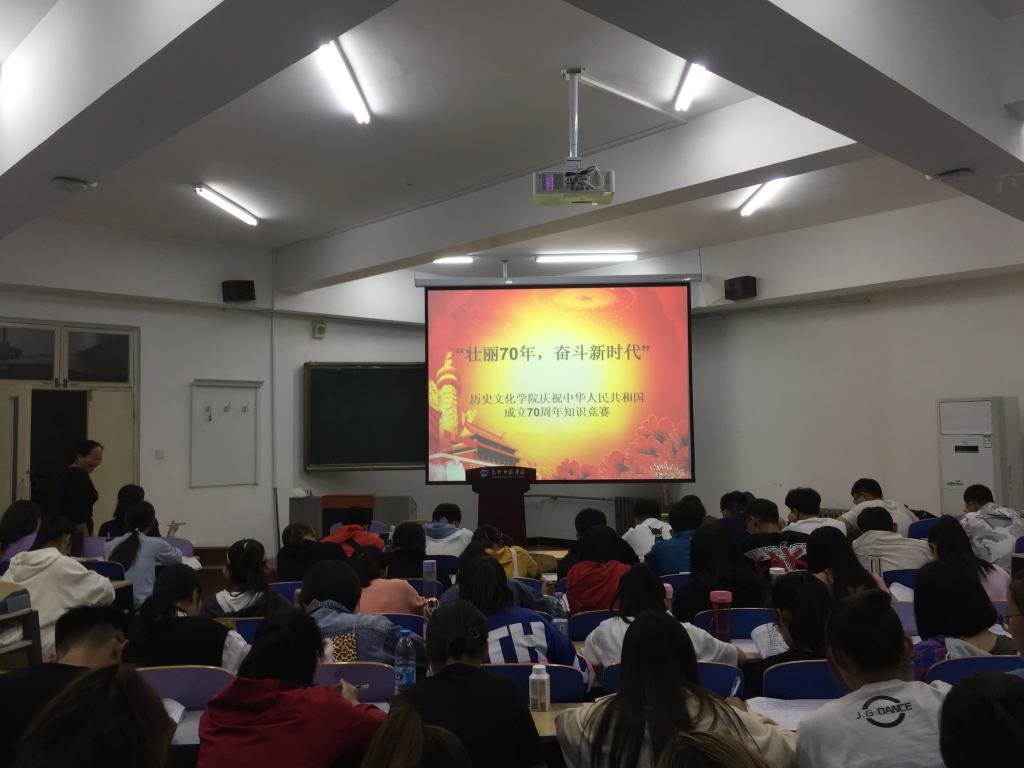 为庆祝中华人民共和国成立70周年,激发广大师生的爱国热情,凝心聚力,历史文化学院于9月25日举办了“壮丽70年 奋斗新时代”——庆祝中华人民共和国成立70周年主题党日暨知识竞赛活动。学院全体教师、研究生、本科生近500人参加了活动。