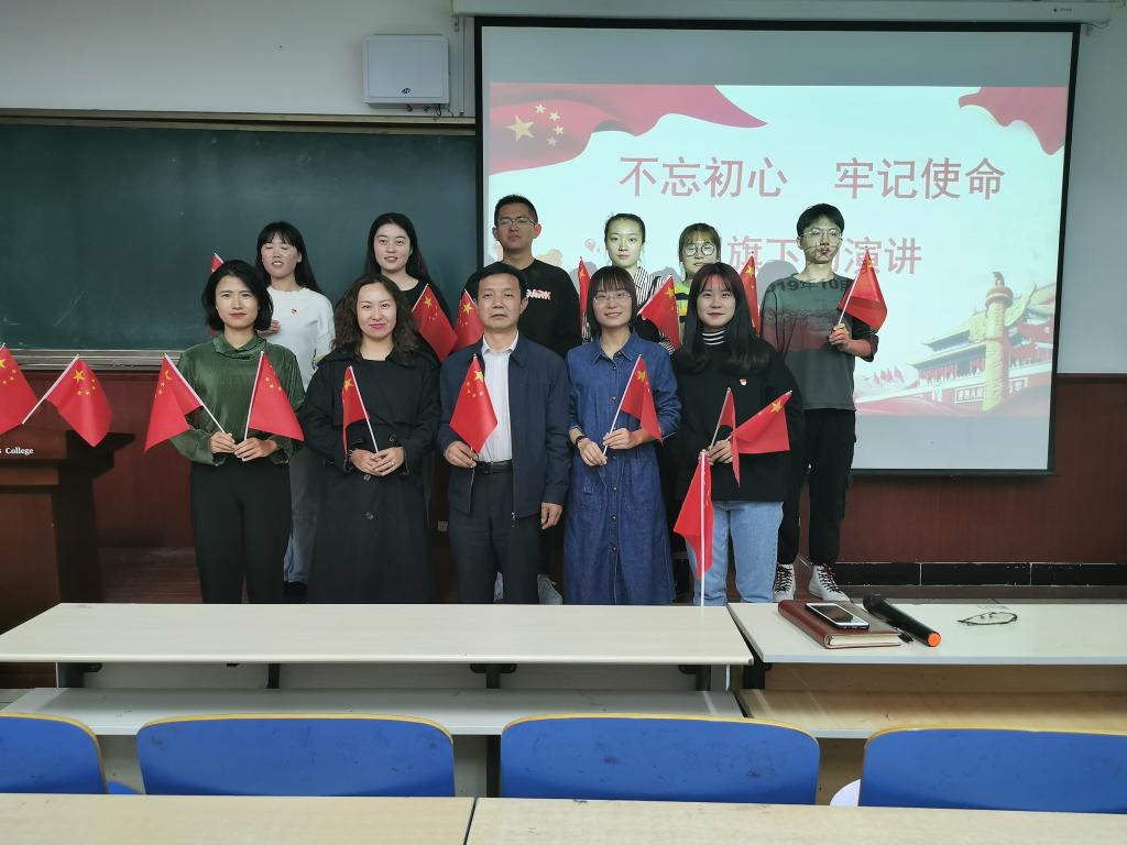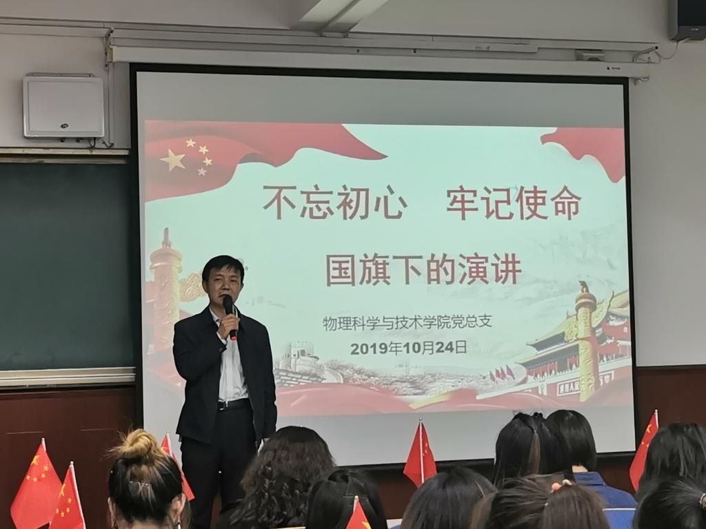 为深入开展“不忘初心、牢记使命”主题教育,提升教育实效,强化教育效果,物理学院党总支于10月24日在博学楼500举办了“不忘初心、牢记使命”主题教育“国旗下的演讲”特别主题团日活动。学院党总支书记王飞全,党总支副书记、副院长吕煜瑜,学生党支部书记兼团总支书记张锐,党支部书记李慧慧、徐洋,全体学生党员及二三年级全体积极分子参加。