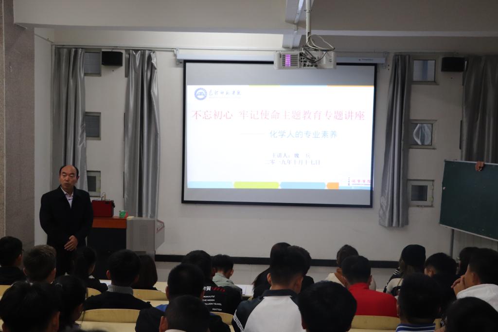 为积极推进“不忘初心,牢记使命”主题教育,化学学院党总支继续落实“支委讲党课”活动,继前一时期由党总支书记史继敏开讲“初心与使命”、党总支副书记冯丽开讲“《党支部建设条例》解读”、学生支部副书记丁瑞丽开讲“学习党的历史、铭记党的光辉历程”之后,10月24日下午,魏兵院长(总支委员)在会议室为全体教职工主讲了《专业认证与专业发展》,他从唤起质量意识、培养卓越人才、提升教师素质和加强师德师风建设四个方面做了详细的讲解。讲座中魏院长要求大家要严格践行新时代对高等教育工作者的要求,积极努力,共同为实现高等教育强国梦而奋斗。教师们也积极互动,就新时期如何做好一名优秀教师交换意见。