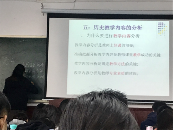 10月30日上午,刘静静老师为大三历史专业讲授“历史教材分析”课程。她从分析教学内容的重要性和历史教学内容的方法两个方面展开,内容线索清晰,举例得当,教授学生通过本课学习科学地分析中学历史教学内容。
