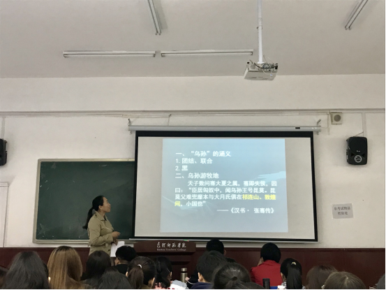 11月1日上午第二节,代小老师为大三历史专业学生讲授“北方民族史”课程中的《乌孙与月氏》,代老师通过生动有趣的历史故事为学生讲述了乌孙名字的由来、经济、政治制度和与中原王朝的关系,为学生们展现了丰富多彩的北方游牧民族文化。