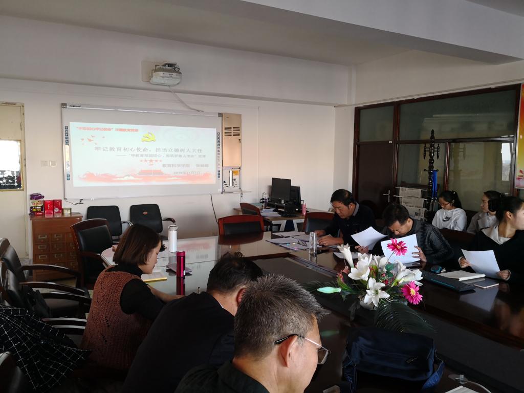 按照学校主题教育“不忘初心,牢记使命”的工作安排,11月7日下午,教育科学学院党总支书记张岫峰在学院会议室作了题为《牢记教育初心,担当立德树人大任-守教育报国初心,担筑梦育人使命》的主题教育专题党课。教科院全体党员干部、教师及学生党员干部共50余人聆听了党课。