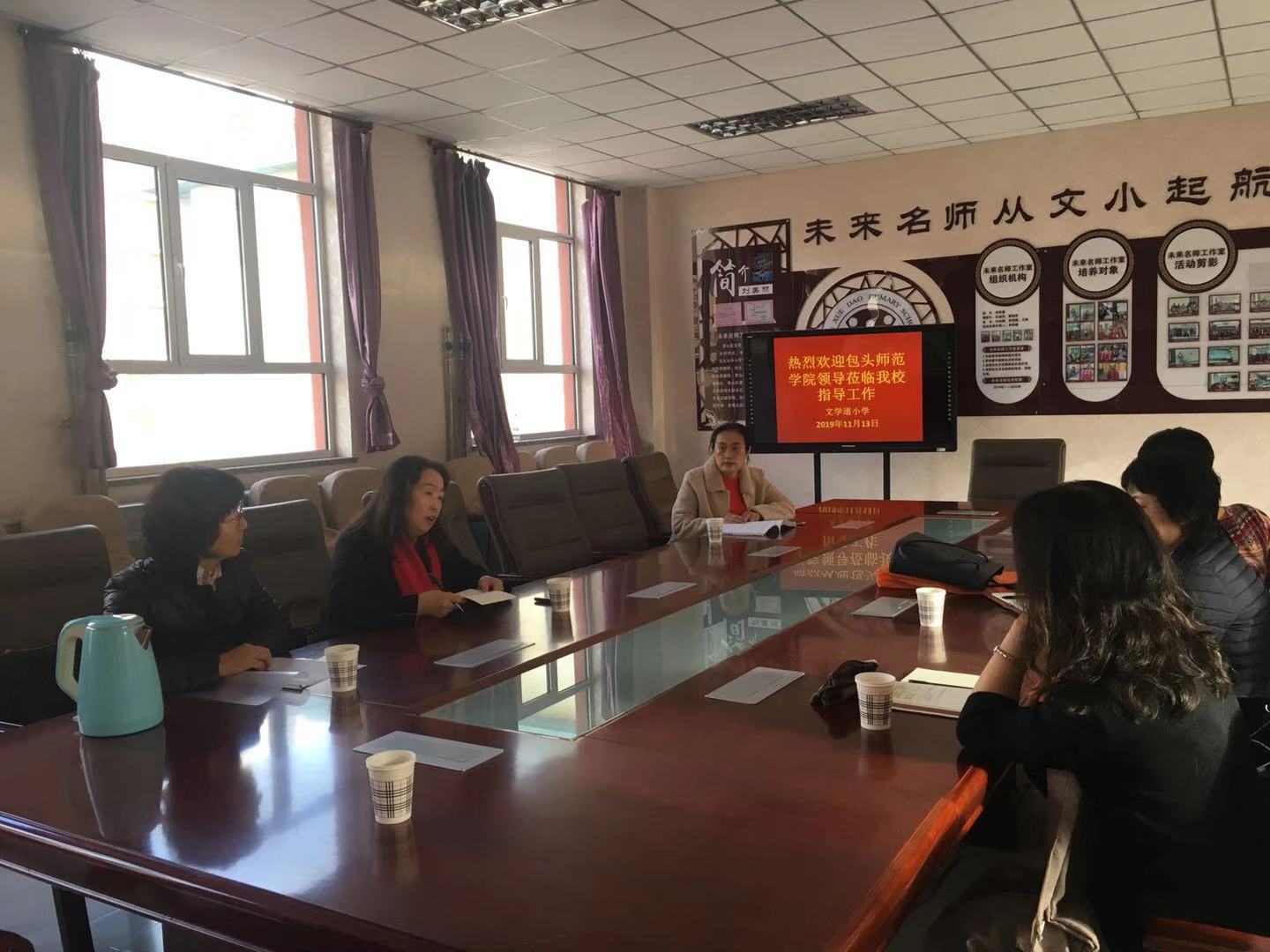 为了了解2016级学生的实习情况和实习基地的需求,沟通实践基地的建设规划,11月13日下午,我校教务处副处长周慧霞,教育科学学院郝红英院长、副院长李芳、主任徐丽华和部分教师赴文学道小学开展调研工作。文学道小学的刘美丽校长及相关工作人员热情接待了我校领导和教师。
