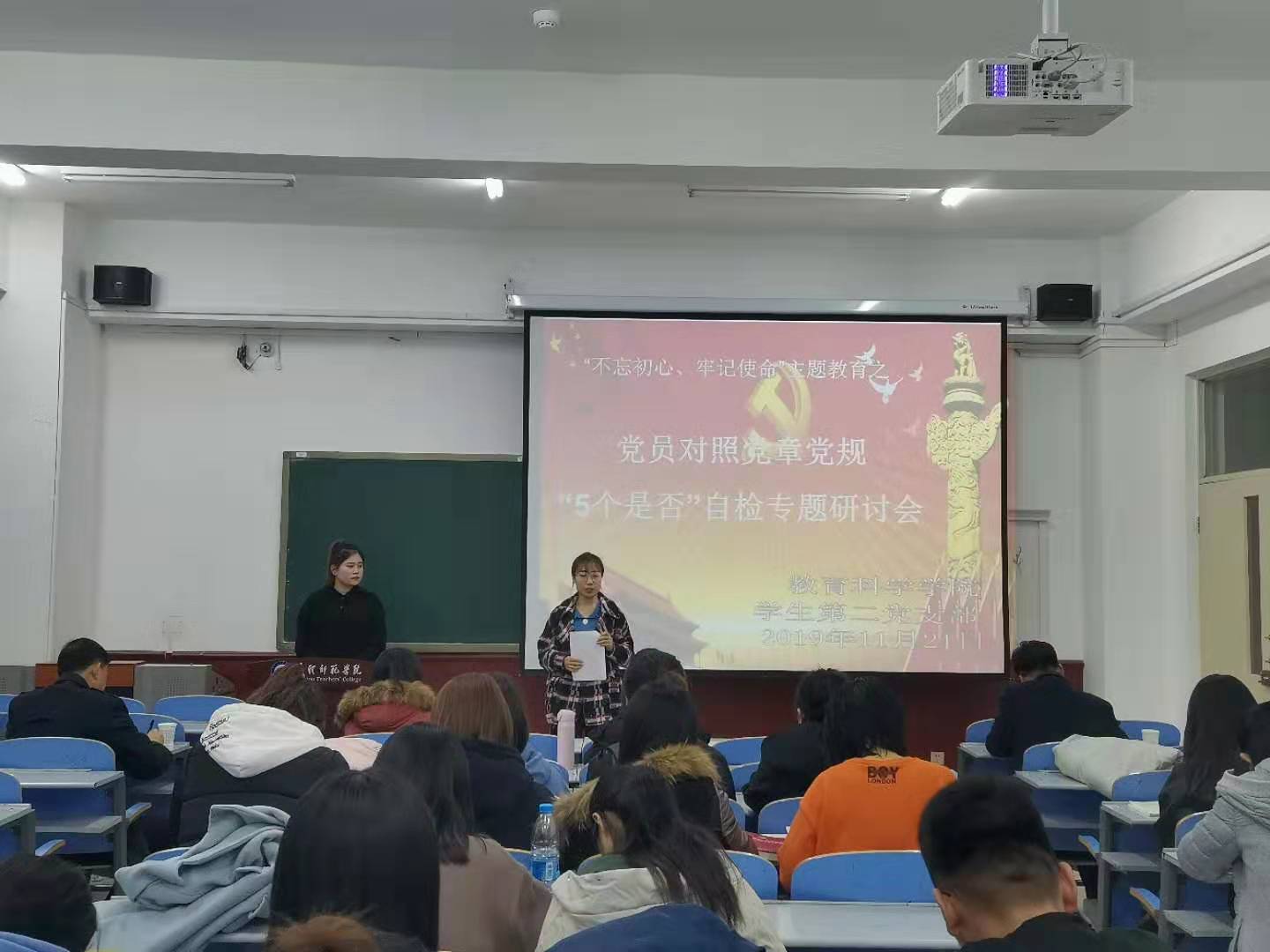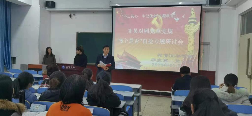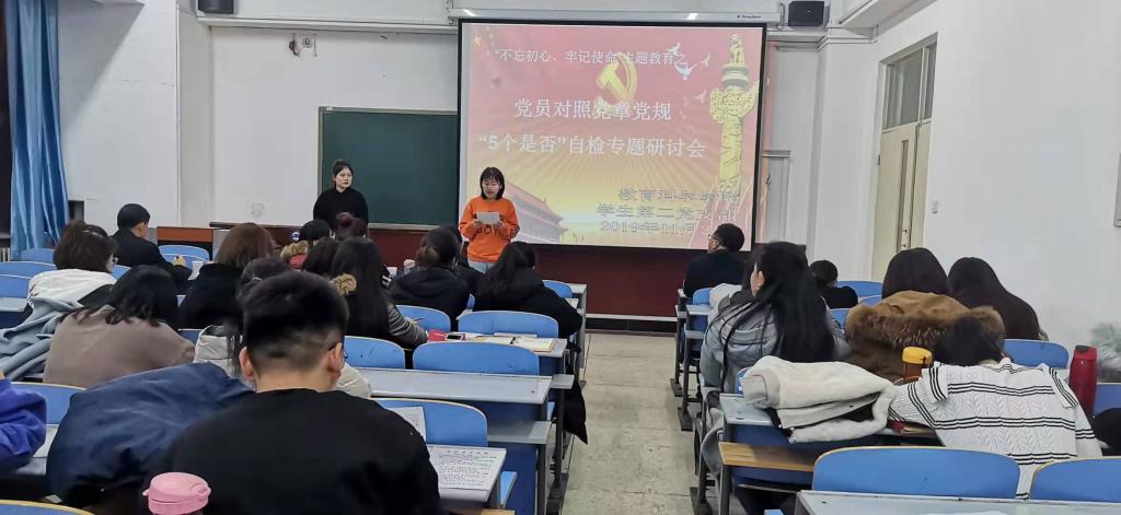 为深入学习贯彻十九届四中全会及习近平总书记重要讲话精神,落实学院党总支“不忘初心、牢记使命”主题教育安排,教育鞭策学生党员不忘党员本色,更好地发挥先锋模范作用,教育科学学院学生第二党支部于11月21日晚在博学楼东306教室开展了“不忘初心、牢记使命”主题教育之党员对照党章党规“5个是否”自检专题会及党员学习习近平新时代中国特色社会主义思想心得交流会。