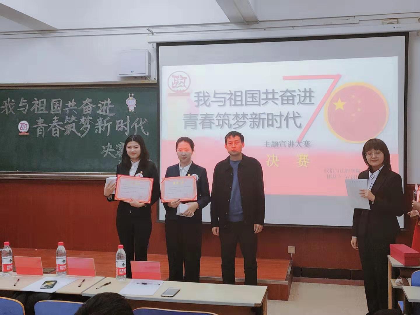 为了提高我校学生政治理论水平,推进我校思想政治教育工作的开展,让当代大学生肩负起新时代下的使命责任与担当,政治与法律学院在全校举办以“我与祖国共奋进,青春筑梦新时代”为主题的宣讲大赛。大赛从11月初开始,经过初赛、复赛,于12月4日在博500举行了决赛。