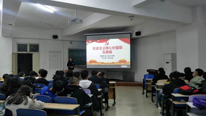 物理科学与技术学院学生第二党支部学习社会主义核心价值观系列活动进行了近一年,学习宣讲按照内容分阶段进行,取得了良好的学习效果。为了持续推进大学生社会主义核心价值观教育,学生第二党支部党员杨鸣、李佳蓉同志于12月10日至12日为2018、2019级全体同学进行了以诚信、友善为主题的宣讲。
