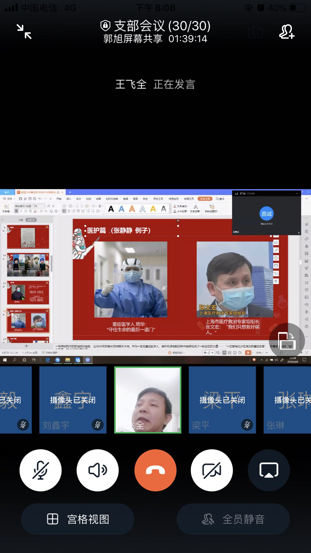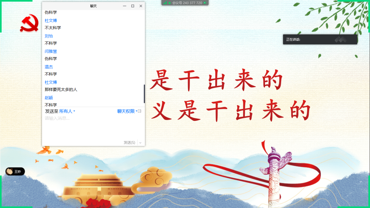 物理学院党总支书记王飞全老师和副书记吕煜瑜老师分别进入团支部,参加了党支部的主题宣讲活动。两位老师肯定了党支部对两个宣讲主题的选择和党员讲师团的宣讲质量,认为这是一种很好的加强理论学习、把握时政热点的方式,也是党团共建的有效方式,有利于发挥党员的先锋模范作用,希望党支部在现有工作基础上,再接再厉,打牢基础,补齐短板,继续探索创新党支部建设的方式方法,勤思多悟,把党支部建设推上新的高度,以优秀的创建成果迎接教育部对样板党支部的考核验收。(物理科学与技术学院)