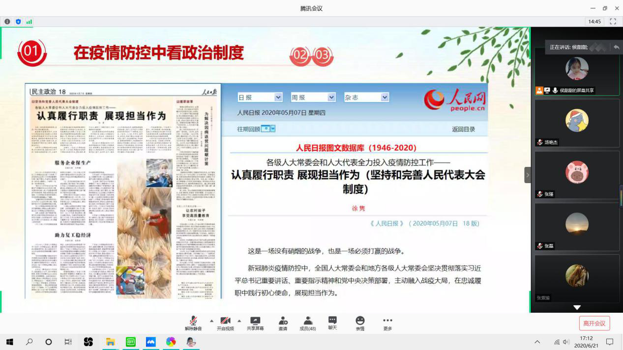 新冠疫情给我国和世界人民生命健康造成了灾难性后果。反观我国和世界各国疫情防控,我们切实感受到了中国共产党的伟大,为此,党支部及时把握疫情防控这个主题,拟定“疫情中识真劲党,防控中见强担当”、“从疫情防控看社会主义的政治优势和制度优势”两个主题,走进各班级开展宣讲。宣讲前,经过多次充分的线上内部研讨交流,学院党总支领导指导完善,两个主题分别于4月下旬和6月中下旬进入16个班级团支部宣讲交流。