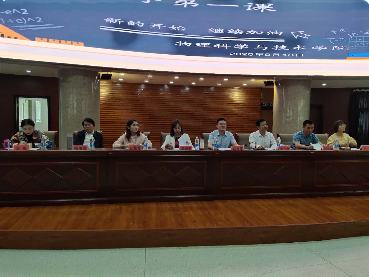 9月18日下,物理科学与技术学院在学术报告厅为同学们上了开学第一课。物理学院党总支书记王飞全、院长赵建军、副书记副院长吕煜瑜、副院长郭凯敏、学工办主任张锐、辅导员刘龙以及2020级新生班主任 、助理班主任出席。物理学院全体新生到场参加。