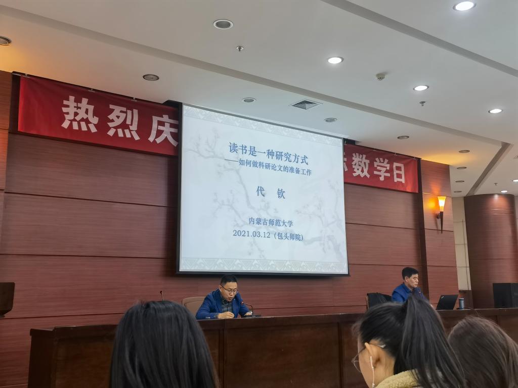 为庆祝第二个国际数学日,数学科学学院于3月11日至14日间举办第一届“πDay”学术节。3月12日上午10点,数学科学学院和研究生院共同邀请到全国数学教育研究会秘书长、中国少数民族数学教育专业委员会常务副理事长、教育部民族教育专家委员会委员、内蒙古师范大学博士生导师代钦教授开展题为“读书是一种研究方式——如何做科研论文的准备工作”的专题讲座,全校在读研究生和数学科学学院2018级学生到场聆听讲座,研究生院院长周智慧和数学科学学院班子成员、教师代表也参加了讲座。