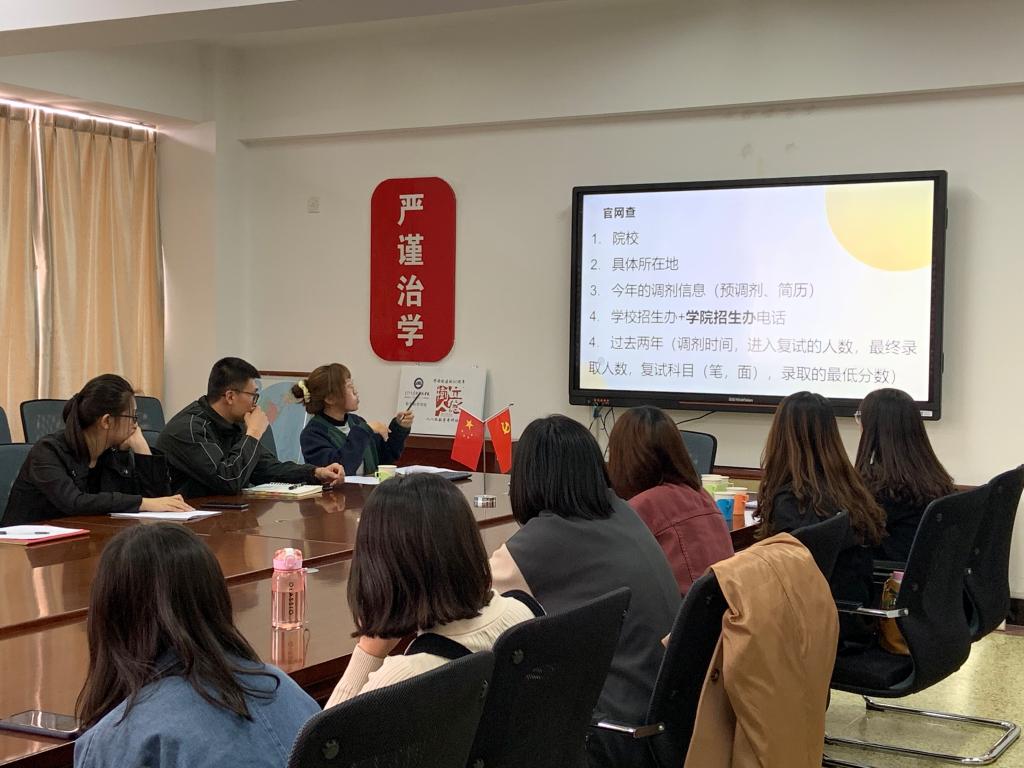 郑丽娜、刘瑞琪、薛玉玲分别从面试前的准备、面试环节和注意事项、调剂信息来源和院校选择等角度与考研学生进行了深入交流,姜雪、郭亚楠则从职业发展方向、面试的目的、调剂思路等角度作了补充。