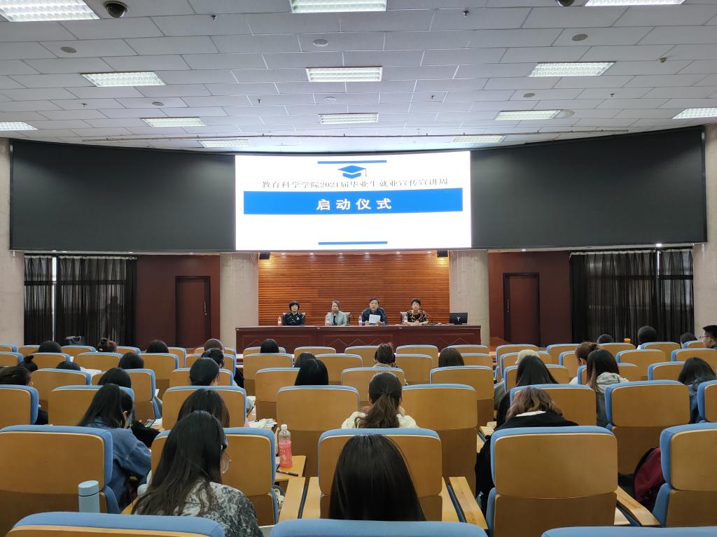 在启动仪式上,党总支书记张岫峰同志做毕业生就业工作动员讲话,就2020年就业形势和学校学院就业落实情况进行了简要回顾,对2021年的高校毕业生就业形势从全国和自治区高校毕业生就业形势依然复杂严峻、毕业生规模再创新高、往届与应届存在竞争、政策性和市场化就业岗位有限且与高校大学生就业需求和求职匹配供求矛盾等方面进行了详细分析,并结合去年本院毕业生择业就业方面存在的问题提出了有针对性的建议和要求。随后,党总支副书记李燕同志为毕业生介绍了今年教育科学学院在推动就业工作中的具体思路和举措,并就毕业生参加就业指导宣传宣讲周活动提出了具体要求。
