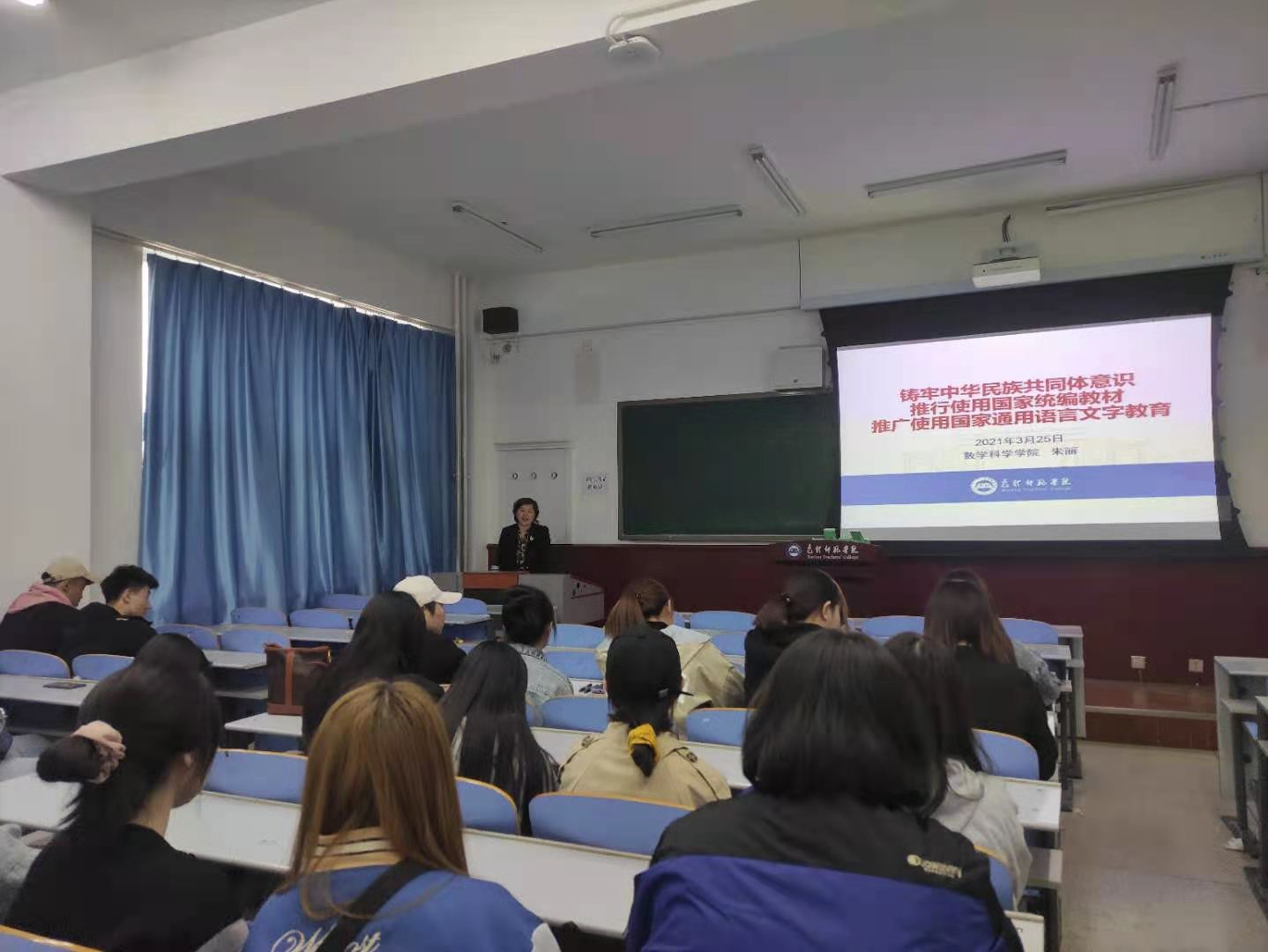 3月25日下午,数学科学学院在博西313召开学生座谈会,党总支副书记姜雪代表学院班子就年初民主生活会征求意见整改情况向参会学生作出通报,并解答了学生关于普通话测试、学业发展、预科生就业等方面的问题。之后,党总支书记朱丽在博西303为学生做了铸牢中华民族共同体意识专题形势政策讲座。朱丽从全面准确理解铸牢中华民族共同体意识、全面准确理解推广普及国家通用语言文字教育、全面准确理解推行使用国家统编教材等角度进行了深入解读,结合2021年政府工作报告和习近平主席参加十三届全国人大四次会议内蒙古代表团审议时的讲话,让学生对铸牢中华民族共同体意识的重要性和必要性有了更清晰、更深刻的认识。数学科学学院少数民族学生代表参加了此次座谈会和讲座。(数学科学学院)