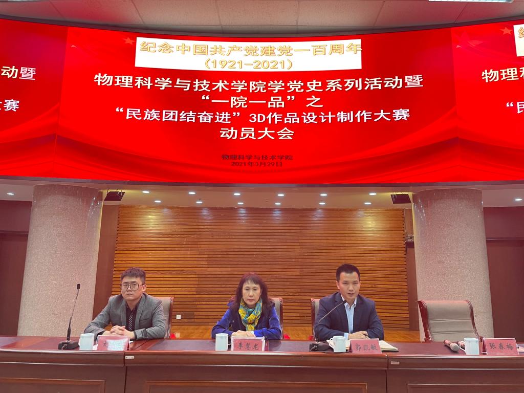 建党100周年之际,物理科学与技术学院特举办学党史系列活动暨“一院一品”之“民族团结奋进”3D作品设计制作大赛动员大会。