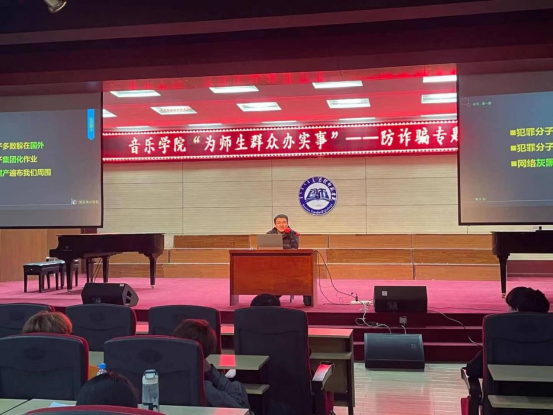 为进一步增强大学生法治观念,提高学生安全防范意识与自我保护能力,引导学生预防和远离诈骗,助力推进平安校园建设,4月8日下午,音乐学院邀请包头师范学院保卫处陈东胜老师为2020级新生及辅导员助理开展防诈骗专题教育讲座,宣传普及防诈骗知识。