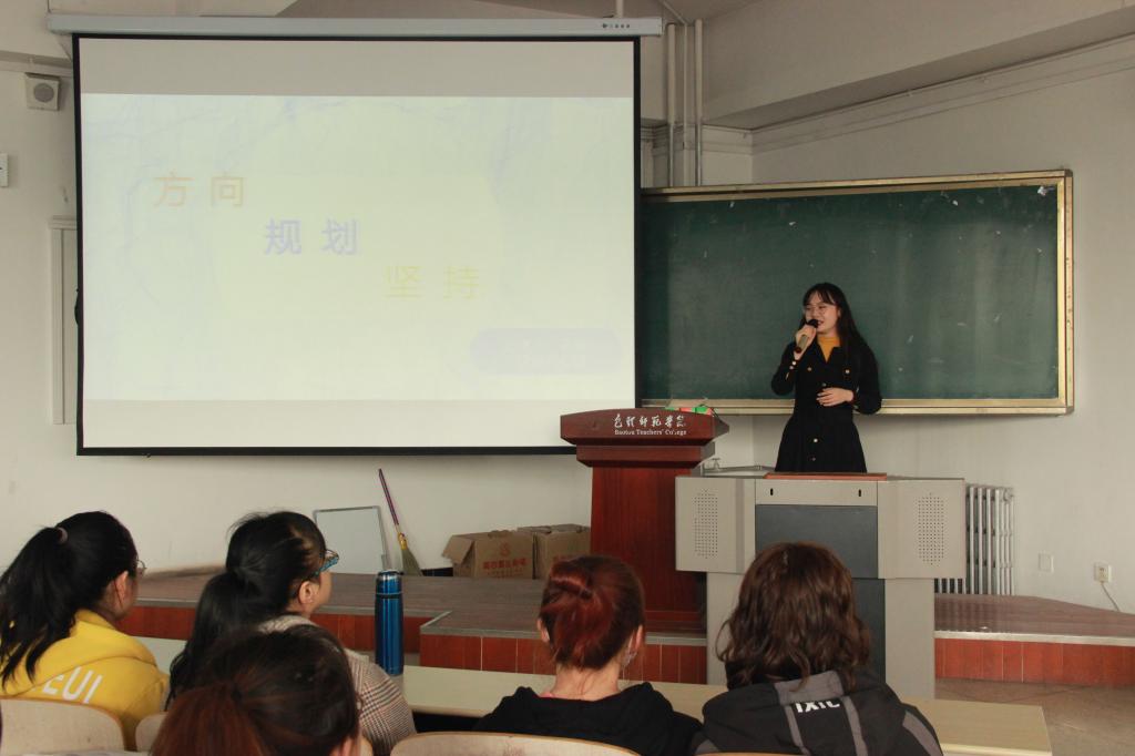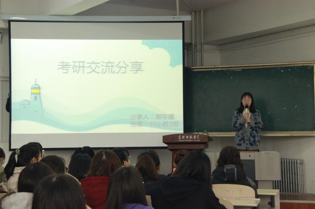 郝宇雁同学分享了自己考研的心路历程,引导同学们正确面对和处理考研期间的各种情绪,并强调了合理的规划、安排好时间是最重要的。张慧敏和靳璐都分享了在考研期间“坚持不懈的努力、坚定的考研决心、合理的时间规划、正确的心理心态”四个方面的重要经验。韩悦同学通过自己研究生复试准备经历,分享了面试的各种小技巧,并告诉同学们“机会永远留给有准备的人”这一道理。顺利考上康巴什幼儿教师的侯亚楠同学提醒同学们在求职时要注意多方面的招聘信息,她鼓励同学们在平时多积累才能才艺,这样才能在众多的幼儿教师求职者中脱颖而出。王姝婷同学也分享了自己考取东胜区的小学数学教师的复习经验和面试感悟。