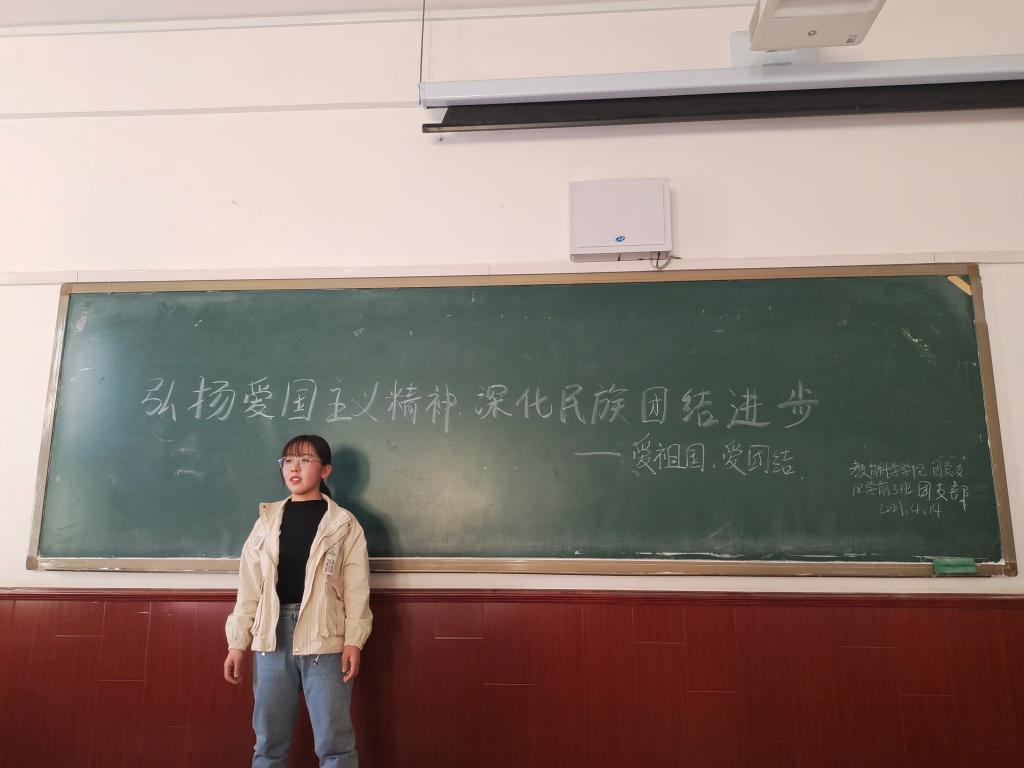 为贯彻落实《关于深入推进2021年全区学校共青团“驻校蹲班”工作》、《团委关于开展2020-2021学年第一学期主题团日活动的通知》等有关文件精神,更好地了解学生思想动态和学习生活状况,直接联系、直接服务、直接引领团员学生,4月14日教育科学学院2018级学前3班全体同学在博东202教室开展“弘扬爱国主义精神,深化民族团结进步”的主题团日活动,负责“驻校蹲班”的辅导员王璐然老师参加活动。
