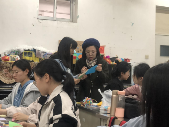 活动准备阶段,各社团成员齐心协力,共同创作优秀作品。同学们将庆祝建党百年、铸牢中华民族共同体意识的主题与传统文化中的折纸、书法、绘画等形式相结合,以此表达对伟大祖国和中华优秀传统文化的热爱之情。活动期间,社团指导教师樊荣在手工社中,针对花球的制作与色彩搭配、中国结的选材与编织对同学们进行了详细讲解和指导。在童心社中,樊老师结合中国共产党的百年奋斗史,引导同学们创新绘画思路,深刻理解和表达共产党自力更生、顽强拼搏的精神内涵。