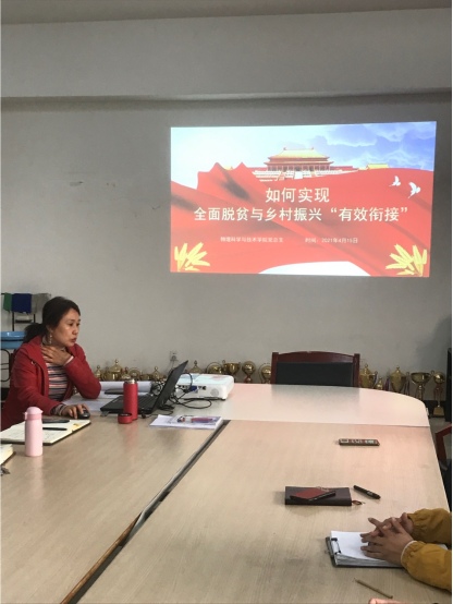 4月15日下午,物理科学与技术学院在新逸夫楼527开展了主题为“学党史·办实事”的党课学习活动,物理科学与技术学院党总支书记李慧龙为全体教工党员讲了题为“如何实现全面脱贫与乡村振兴有效衔接”的党课。