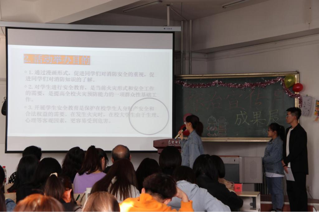 此次活动分三项内容,第一项由李燕副书记作讲话。李书记对本次活动的精心组织和策划给予充分肯定,对同学们的积极参与和认真做事的态度给予高度评价,并为学院今后持续开展综治工作提出指导意见。她强调:一是提高政治站位,增强政治安全意识,牢固树立正确安全观,切实加强意识形态防范教育;二是把宣传活动中学到的安全法制、消防、心理健康、防诈骗等知识与实践生活紧密结合,做到内化于心,外化于行;三是建立校园安全教育学习长效机制,构建综合防控体系,时时讲安全,处处讲安全,增强“综治宣传月”的活动效果。第二项是学生会各部门代表总结部门工作并进行活动成果展示,其中易班制作了网络宣传链接;公寓部消防志愿服务队形式深入到教学楼和宿舍中排查安全隐患,以小视频形式为大家不安全用电等行为敲响了警钟;文艺部小品“冷眼相贷”诙谐幽默,引发阵阵掌声;社团大合唱及手语节目歌声悠扬、回味无穷。多种形式的安全、消防宣传进一步增强了同学们安全防范意识和自我防范能力,也给活动的开展增添了色彩。同时,展厅里展出了“宿舍安全,从你我身边做起”和“漫宣传,齐防火”为主题的优秀作品,再一次强化了安全知识的传播。第三项由负责本次活动辅导员刘佳琪做总结,她希望每一个同学能做到不忘初心,牢记使命,将安全知识入脑入心,努力成为新时代的优秀大学生。