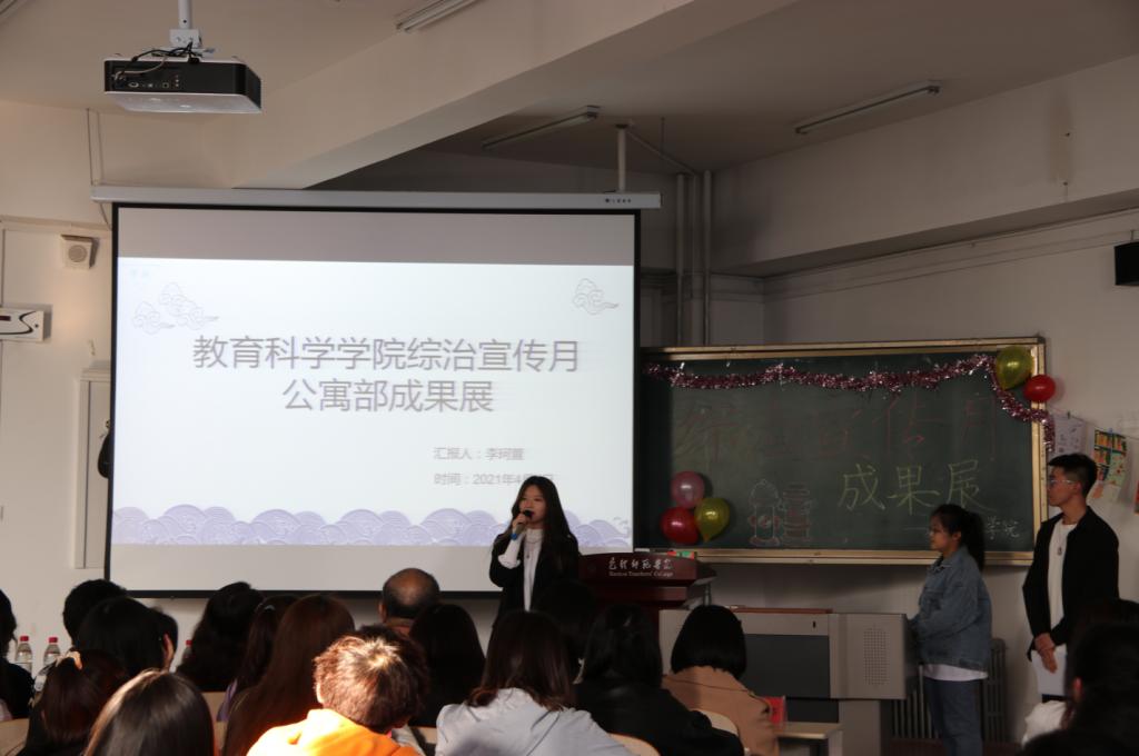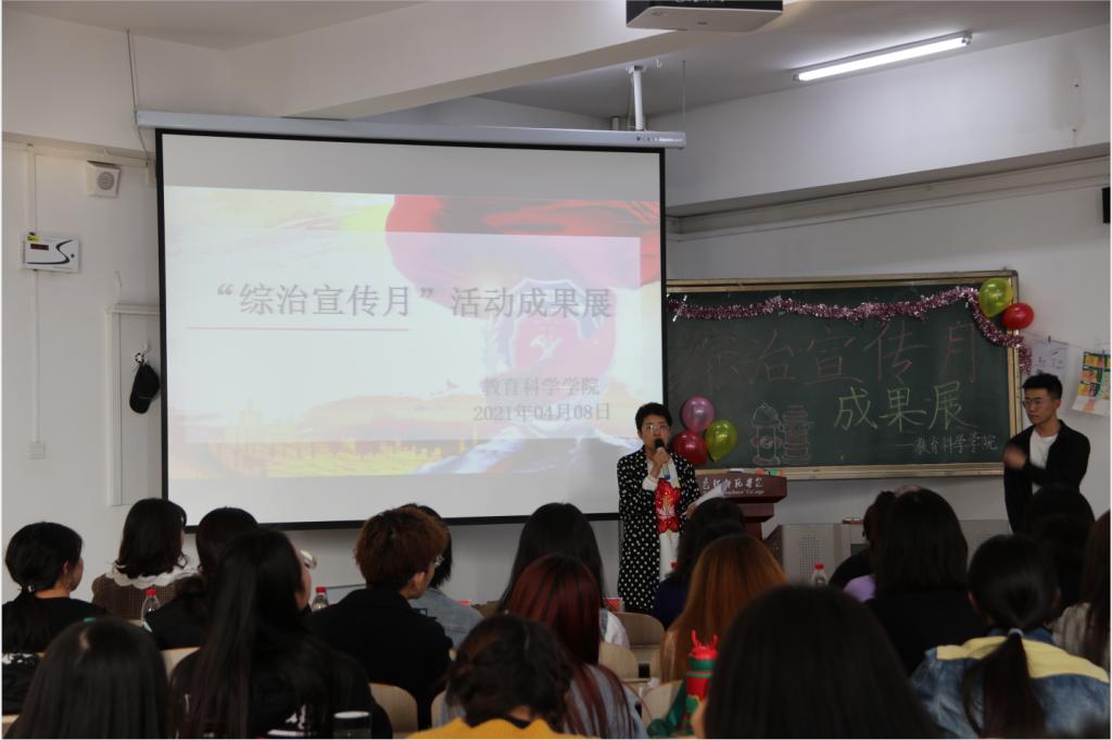 为深入贯彻落实习近平总书记关于安全生产的重要批示指示精神和全国全区学校安全工作会议精神,教育科学学院积极响应学校《综治办关于组织开展“综治宣传月”活动的通知》要求,结合开学实际工作,以“巩固校园安全综合防控体系,筑牢校园安全维稳屏障”为主题,以加大意识形态防范教育、加强国家安全、人身财产安全、食品卫生安全、交通安全、消防安全、防范校园贷、电信诈骗等宣传教育为主线,对本次活动进行积极筹划、精心安排,并充分调动学生会干部的积极性,多部门协调联动配合,认真组织开展了一系列“综治宣传月”相关活动。4月8日下午,教育科学学院学生会在博学楼东204举行“综治宣传月”活动成果展。出席本次活动的主要领导有学生处副处长杜志敏、保卫处副处长邢忠诚、教科院党总支部副书记李燕和全体辅导员。
