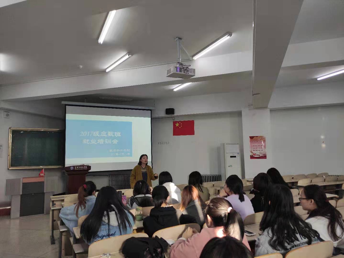 为进一步推进学院2021届毕业生就业工作,帮助学生把握时机,实现多元、充分就业,4月27日下午,数学科学学院召开2017级应数专业就业培训会,党总支副书记姜雪、辅导员郭亚楠、班主任郭鹏云和2017级应数专业两个班的学生参加了培训会。