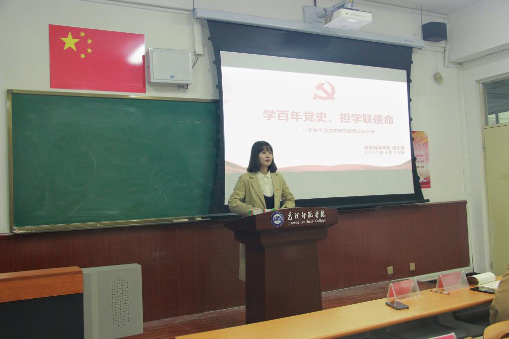 为迎接建党100周年,进一步贯彻落实习近平总书记在党史学习教育动员大会上的讲话精神,引导学生会干部正确认识党情国情,做到知史爱党、知史爱国,不断培养爱国之情,延续艰苦奋斗的优良作风,教育科学学院于4月28日晚在博西101举办“学百年党史,担学联使命”学生会干部党史学习教育交流研讨活动,辅导员王璐然、何美娜、学生会干部及70余名学生参与活动。
