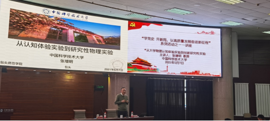 5月7日下午3点,物理学院开展了主题为“学党史 开新局,以高质量发展奋进新征程”的系列活动,为了切实提高教师与学生对物理实验重要性的认识,推动物理学科师范专业认证工作,物理学院邀请中国科学技术大学张增明教授在博学楼学术报告厅作了题为“从大学物理认知体验实验到创新研究性实验”的讲座。