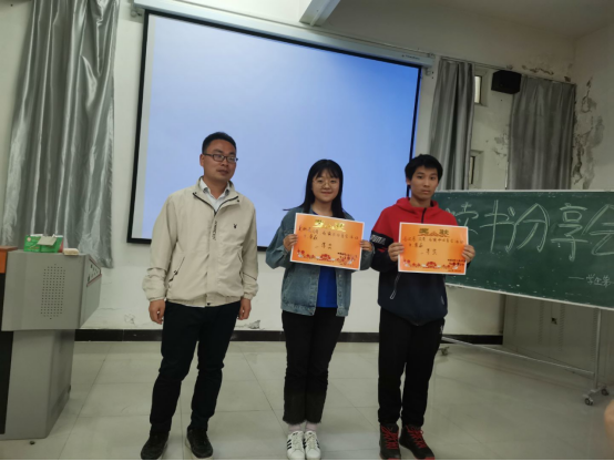 经过激烈角逐,本次活动评选出一等奖两名、二等奖三名、优秀奖四名,王兴生老师对本次读书分享会获奖同学进行了颁奖与奖励,最后对本次活动进行了点评与总结,希望通过读书会,营造一个读书思考、讨论交流、表达自我的环境,带动同学们积极阅读书籍、充实自己。(物理科学与技术学院)