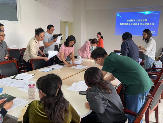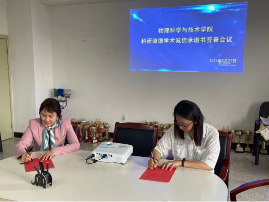 为了营造诚实守信、风清气正的科技创新环境,物理科学与技术学院于2021年5月27日下午在新逸夫楼327会议室召开了“ 科研道德学术诚信承诺书签署会议”。会议由王芳院长主持,党总支书记李慧龙和全体教师参加了会议。