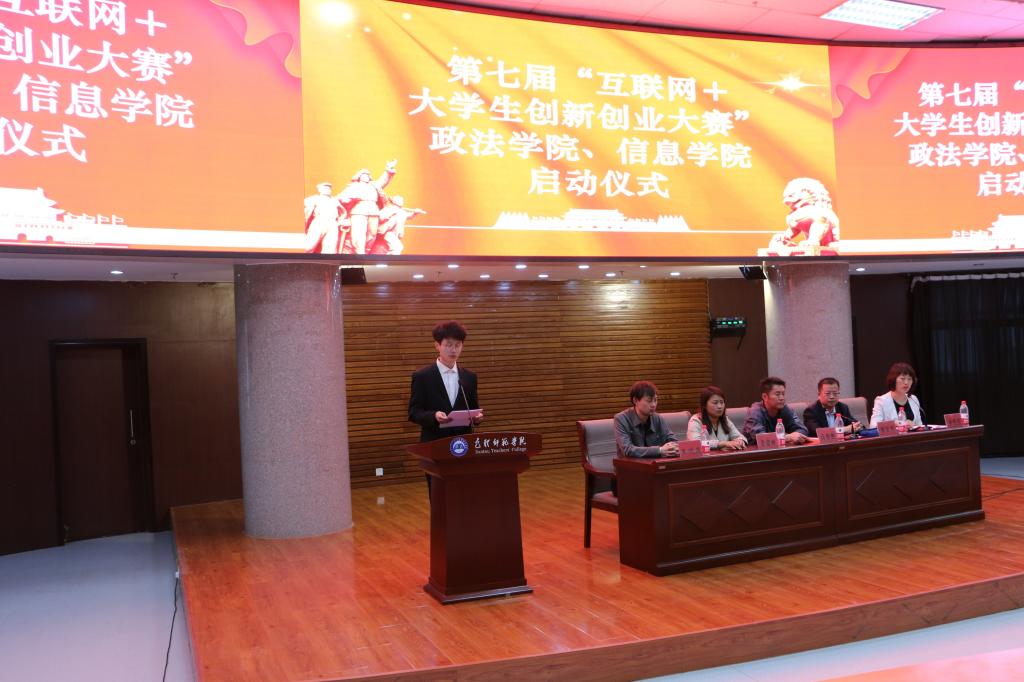 为了加快培养创新创业人才,激发大学生创新创业热情,迎接校赛和省赛,5月25日晚上,政法、信息学院在博学楼学术报告厅联合举办了第七届“互联网+大学生创新创业大赛”院赛启动仪式。政法学院党总支书记高德胜、副书记郭宏升、辅导员王晓庭、信息学院辅导员姜嘉丽、两个学院大二、大三学生代表共500人现场参加了会议,未到会的同学从钉钉直播上参会。会议由政法学院学工办主任袁爱荣主持。