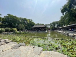 恭王府由府邸和花园两部分组成,花园的设计也巧夺天工,方塘水榭是恭王府花园西路的主要景观,由面积约200平方米的长方形池塘和水中央的湖心亭组成,山中凿泉引水,自池塘三个不同方位的石刻龙头流入池内。