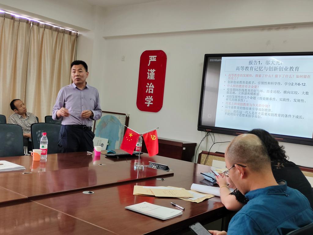 培训会的第一阶段由张东虎院长以《创新创业实践探索》为题,详细介绍了学校创新创业工作,高校双创教育面临的形势与任务,创新创业“五位一体”教育模式以及“五位一体”创新创业取得的成效。张东虎院长提出了创新创业教育要实现两个突破:一是实现从就业从业教育到创新创业教育的突破,以创新引领创业,以创业带动就业,实现我校更高的创新创业的局面;二是实现创新创业人才培养机制的突破,通过创新创业教育,打破学科专业的壁垒,实现多学科交叉融合、跨学科学习、校内外协同的综合效应。张院长还特别针对数学科学学院如何做到专创融合和思创融合进行了详细分析,细致指导学院要通过联系优秀校友项目、教师申报创新创业课题挖掘项目、专业发展建设、实验室科研项目开展、校企合作项目和过往比赛优质项目持续打磨等途径参赛备赛,实现好的竞赛成绩。