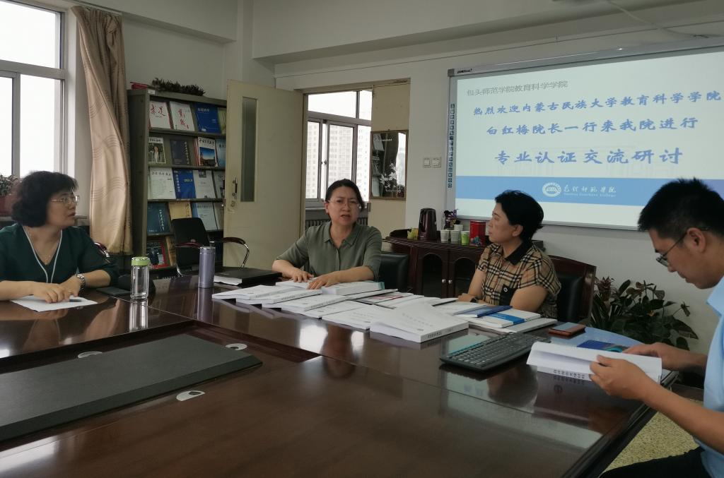 会上,首先李芳院长就专业认证的主线和底线工作做了介绍,刘俊英副院长就课堂教学和课程评价方面做了相关的介绍,小学教育专系主任李秀丽就实践基地情况和课程达成度的工作做了介绍,大家就专业人才培养模式、培养目标、课程设置、学分分配等各方面进行了深入详细讨论,对在专业认证中需要注意的事项进行了深入交流。会后内蒙古民族大学的白院长和姜院长阅览了相关的案头材料。