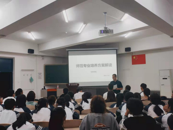 马学林主任向同学们介绍了化学专业与应用化学专业的不同之处,然后对师范专业化学的培养目标、培养内容、课程体系、学制学时年限、教学大纲、就业前景以及毕业要求做出了详细的阐述。